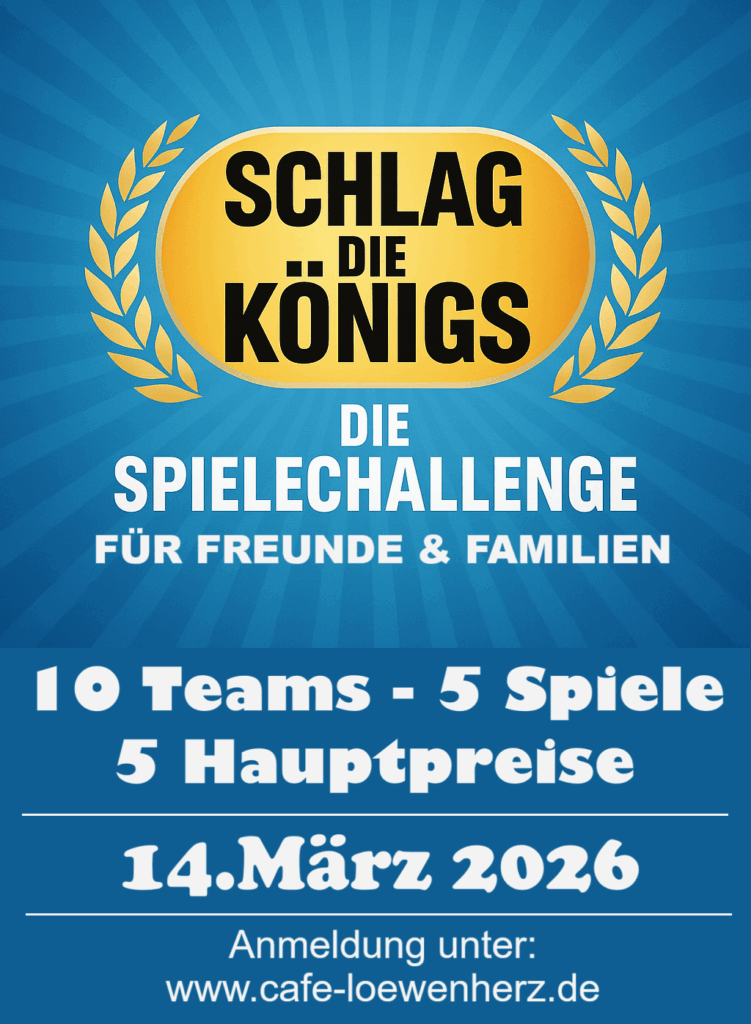 SCHLAG DIE KÖNIG´S! – Die ultimative Spielechallenge *** 10 Teams – 5 Spielrunden – 5 Hauptpreise *** Worum geht es? Tretet im Team mit 4 Mitspielern in spannenden Spielen gegen die „Königs“ an und sichert Euch Ruhm, Ehre und tolle Preise. Egal ob Geschicklichkeitsaufgabe oder kniffliger Denksport – hier ist für jeden etwas dabei! Vielseitige